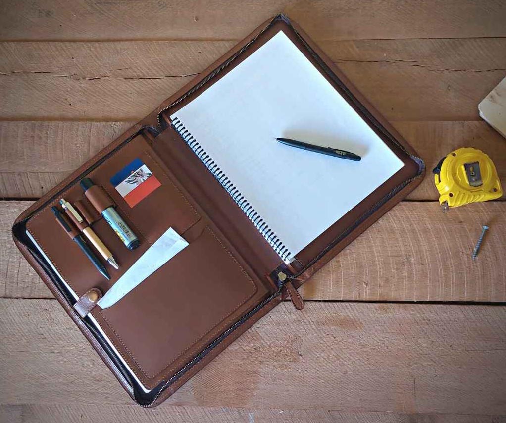 The Work Folder keeps your gear organised: laptop, paperwork, cards, pens, and more — all in one durable, full-grain leather folder. Add your business logo for a polished, on-brand look every time you show up.